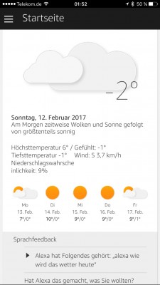 Das gleiche ist auch wenn ich noch den Wetterbereicht abfrage. Frage ich, Alexa wie wird das Wetter morgen, dann kommt der Wetterbericht von dem schon angebrochenen Tag.