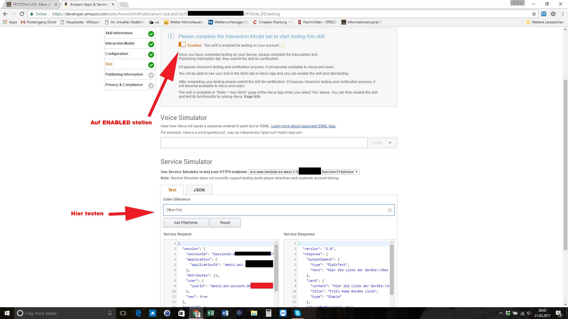 Ich habe den Skill endlich gepackt, das Problem war die Interne Adresse in der Prom Datei, die habe ich auf die externe Adresse geändert. Hat lange gedauert :slightly_smiling_face: Wie lade ich den Skill jetzt auf AWS hoch? Schau mal in die Readme von dem Skill. Ich habe mal ein paar Screenshots vo...