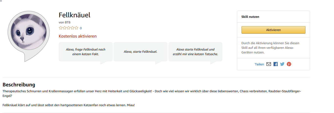 Ich würde mich über Alexa-Besitzer (und vllt. Katzen-Besitzer) freuen die den Skill mal ausprobieren und ggf. ein Feedback hinterlassen möchten.