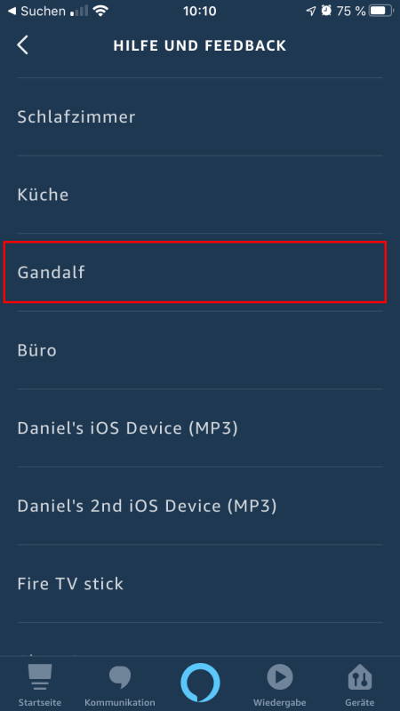 Unter dem Menüpunkt “Hilfe und Feedback” – im Bereich “Vorschläge” -> “Bewertung abgeben” wird dir eine Liste all deiner Geräte angezeigt, welches du auswählen kannst, um an Amazon ein Feedback zu melden. Hier taucht bei mir ein Gerät mit dem Namen “Gandalf” auf, welches mir nicht gehört. Leider ist auch nicht zu erkennen, um welchen Gerätetyp es sich handeln könnte. Also wählte ich dieses Gerät aus und fragte bei Amazon über die Funktion mit dem Problemhinweis “Etwas anderes” nach, was das für ein Gerät sei und ich es nicht kenne. Eine Antwort habe ich hier nie erhalten! Im gleichen Schritt prüfte ich die allgemeine Liste “Geräte” in der App und auch auf der Amazon Seite konnte ich diesen Namen nicht unter “meine Geräte” finden.