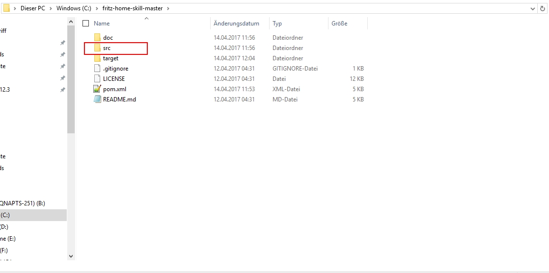 das ist die jar datei die du geladen hast, lade mal folgende Datei bzw den Ordner: fritz-home-skill-master , die müsstest du eigentlich auch haben, da ist der Ordner src drin, ansonsten funktioniert das alles nicht.