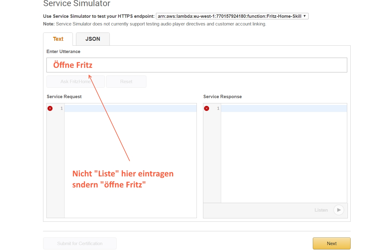 Ich kann soweit alles "erstellen". Wenn es aber ans testen geht in Amazon-developer kommt folgende Fehlermeldung: