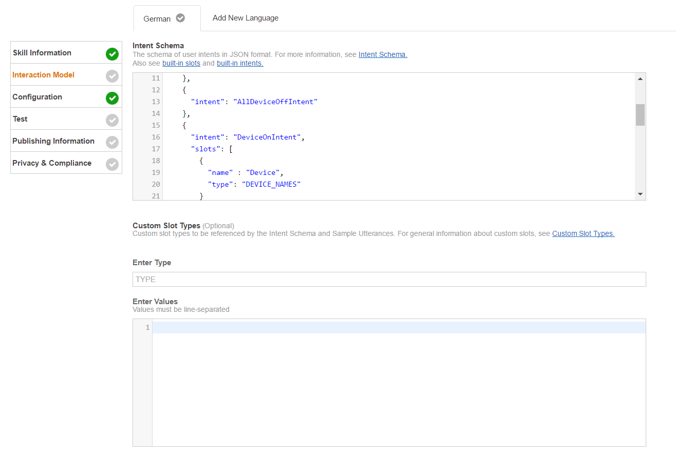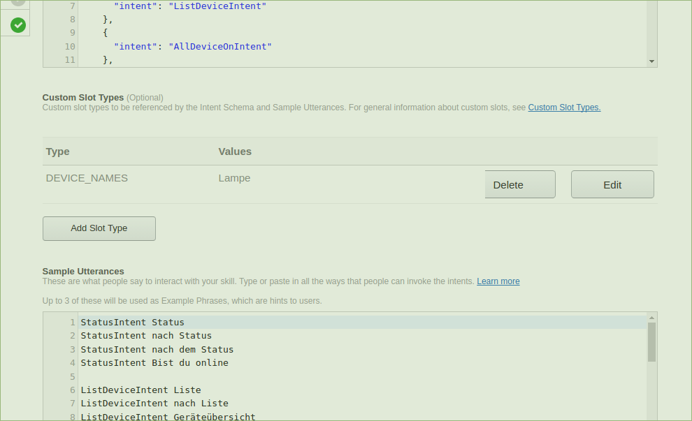 Die Einträge in der "Intent Schema" und "Sample Utterances" habe ich, wie beschrieben, aus den Dateien "IntentSchema.json" und "SampleUtterances.txt".