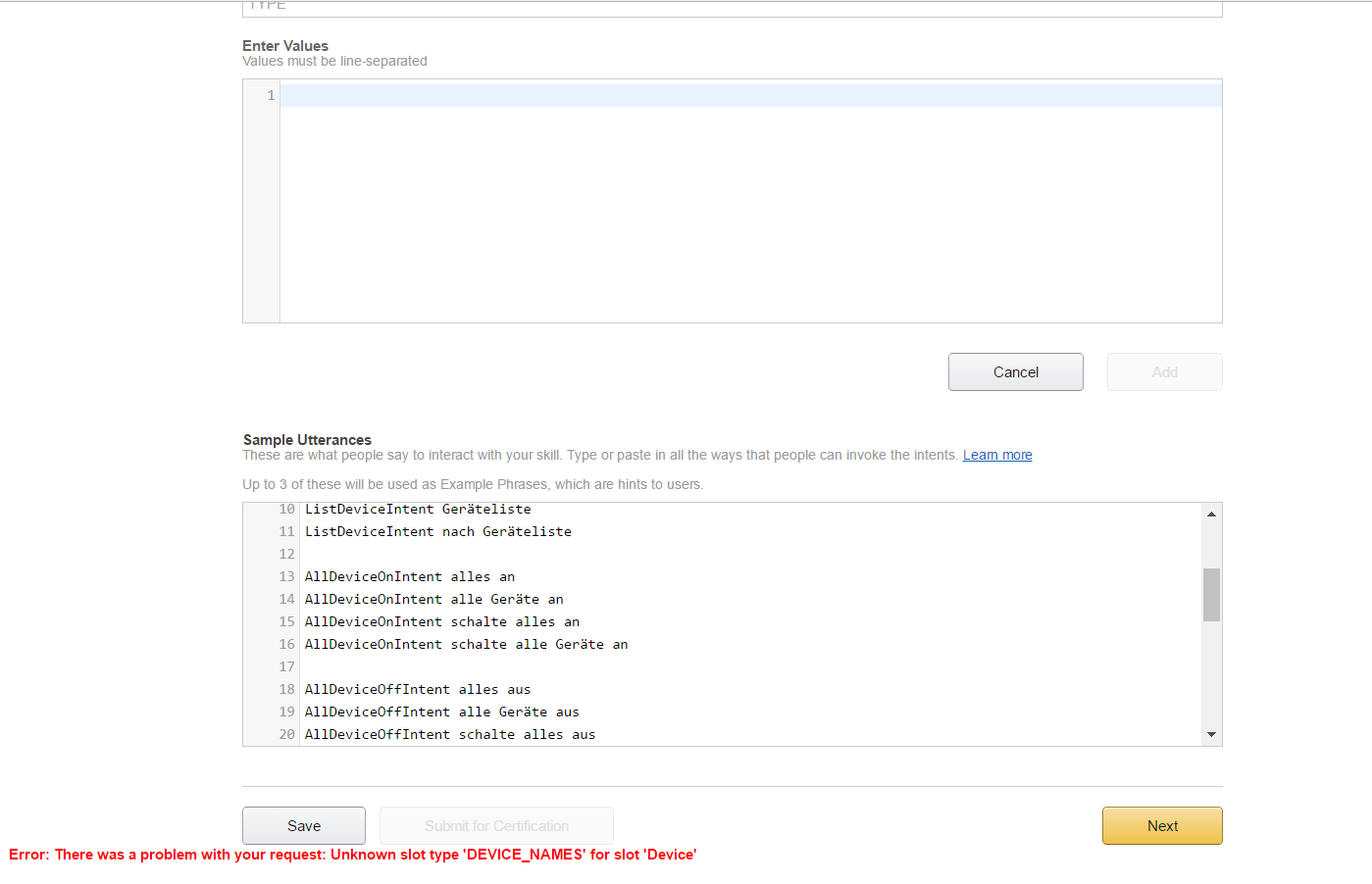 Error: There was a problem with your request: Unknown slot type 'DEVICE_NAMES' for slot 'Device'