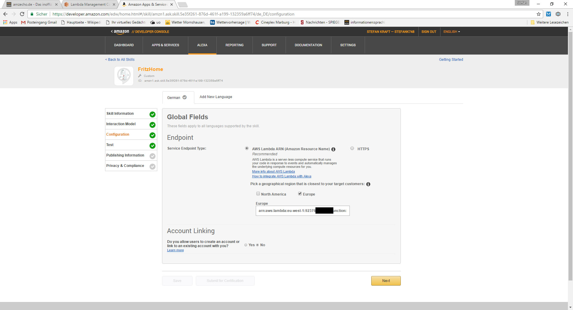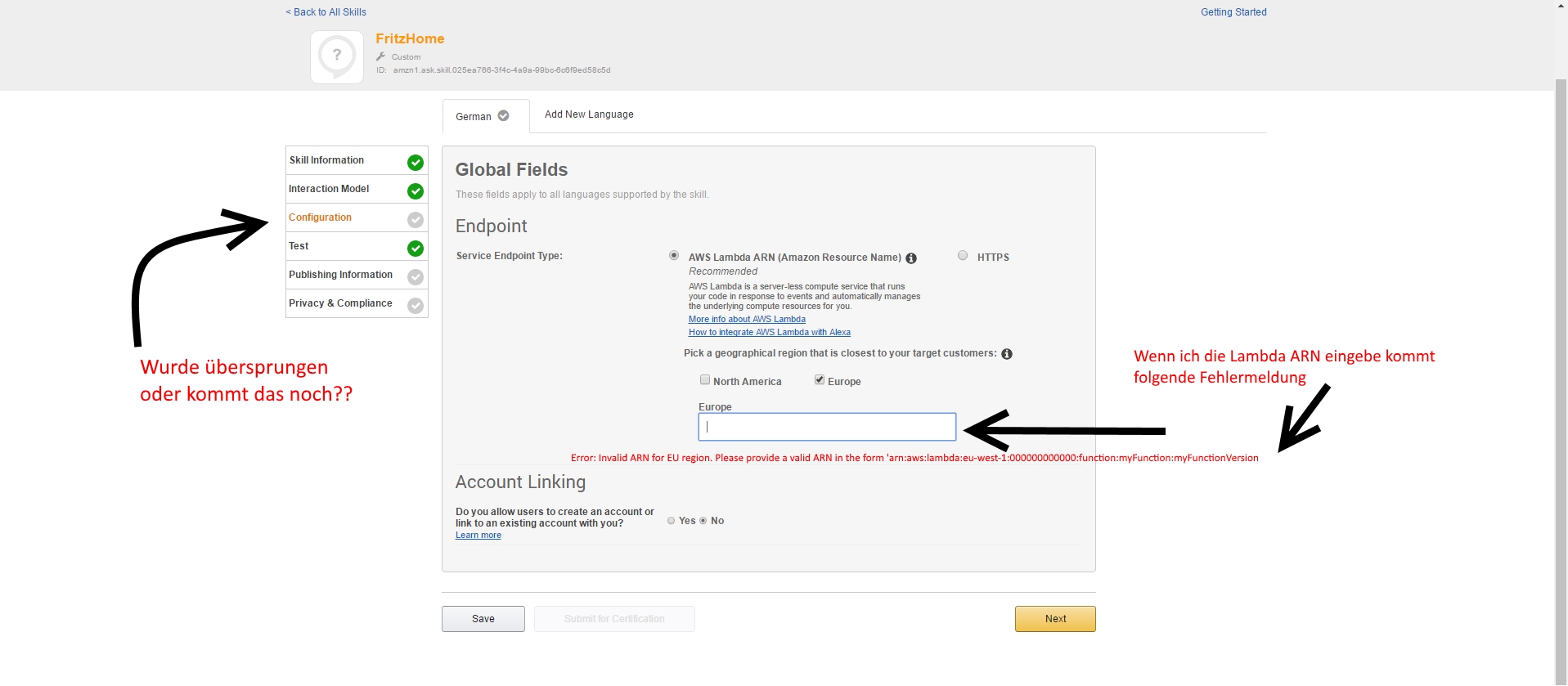 Seit gestern versuche ich mich nun an diesem hier beschriebenen Skill. Leider erhalte ich in der Amazon Developer Console folgende Fehlermeldung: