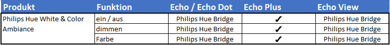 Hilfreich wäre also eine Tabelle, in der man klar erkennen kann, welche Geräte mit welchen Funktionen wie auf den unterschiedlichen Echos unterstützt werden.