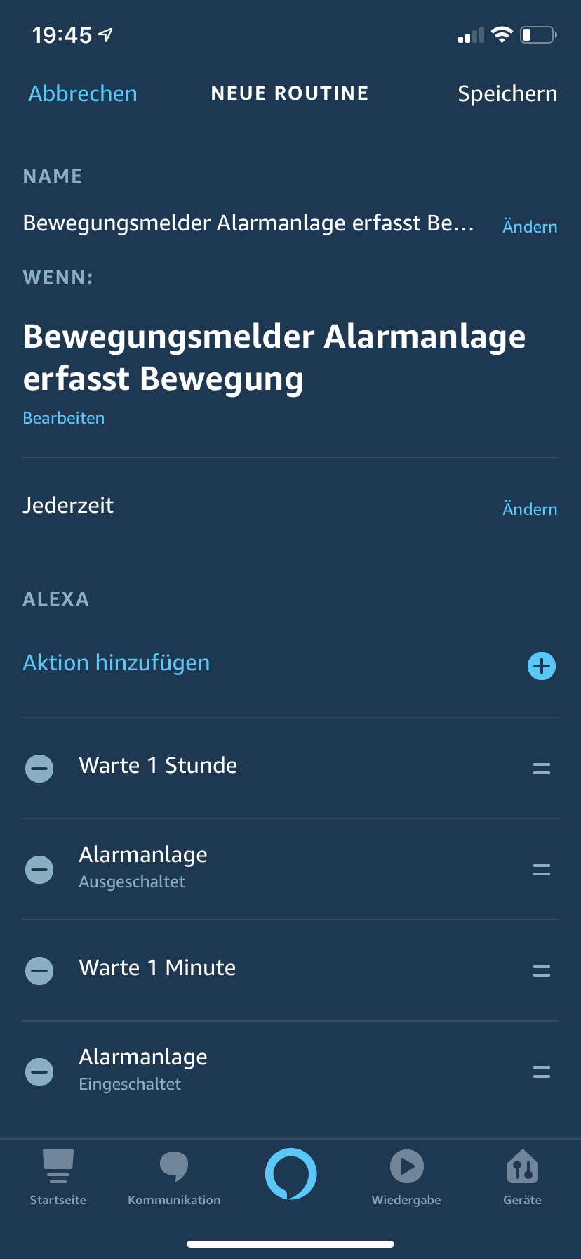Wenn ich natürlich die Wartezeit in der Alarm Routine einfüge dann wartet der Alarm natürlich 1 Stunde bis er aktiviert wird was nicht praktikabel ist. :')