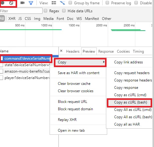 9. Es erscheint in den Developer Tools ein URL Aufruf, der mit "command" beginnt (siehe Screenshot). Diesen müsst ihr rechtsklicken und als Curl Command (bash) kopieren.