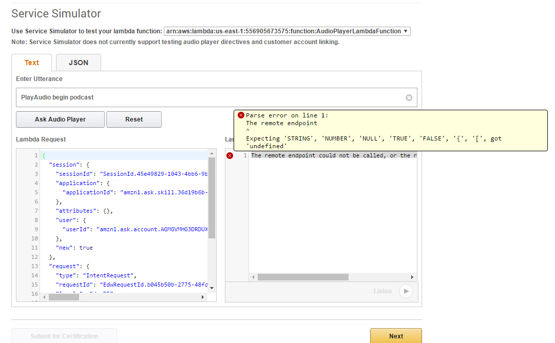 Dann musst Du in die AWS in Lamda gehen und dort die Funktion testen und das als Test übergeben was im Service Simulator Links steht dann kannst Du genauer Debuggen wo das Problem ist.boardrockerz hat geschrieben: ↑Do 30. Mär 2017, 15:24 Ich hänge am selben Beispiel... beim Testen bekomme ich folgenden Hinweis "The remote endpoint could not be called, or the response it returned was invalid."
