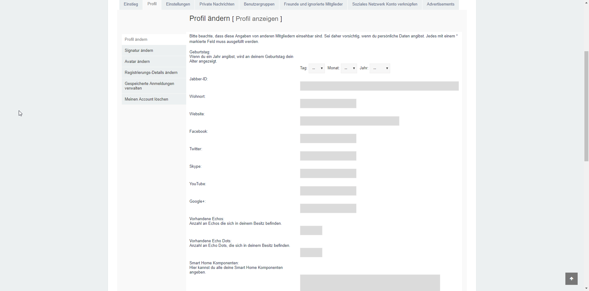 Danke auch hier für den Hinweis. Aus irgendeinem Grund wurde die entsprechende CSS-Eigenschaft vom Designer/Macher auskommentiert.TheSoulrester hat geschrieben: ↑Mi 11. Okt 2017, 15:32 Außerdem ist mir anschließend durch die farbige Hinterlegung der Input-Felder aufgefallen, dass bei den Profileinstellungen die Input-Felder nicht 1:1 der Beschreibung gegenüberstehen, sondern etwas versetzt nach unten.