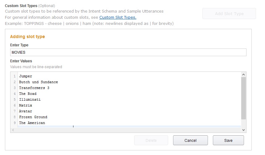 Nun kommen wir zu den Slot Types. Der Skill erfordert das Anlegen von insgesamt 9 Slot Types. Diese heissen MOVIES, MOVIEGENRES, SHOWS, MUSICARTISTS, MUSICALBUMS, MUSICSONGS, MUSICPLAYLISTS, VIDEOPLAYLISTS, ADDONS. Bitte auf genaue Schreibweise achten. Diese legt ihr also an über den Button „Add Slot Type“ und befüllt diese mit Werten aus Eurer Kodi-Datenbank.