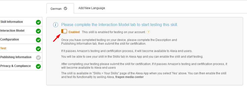 Um die hochgeladene Funktion auf eurem Echo bzw. in Eurer Alexa-App verfügbar zu machen, muss aus dieser Funktion ein „Skill“ werden. Dieses wird aber kein öffentlicher Skill werden, sondern er wird den Status „Test“ oder „Entwicklung“ bekommen und nie öffentlich werden, nichts desto trotz könnt ihr ihn verwenden.